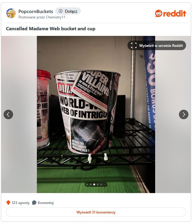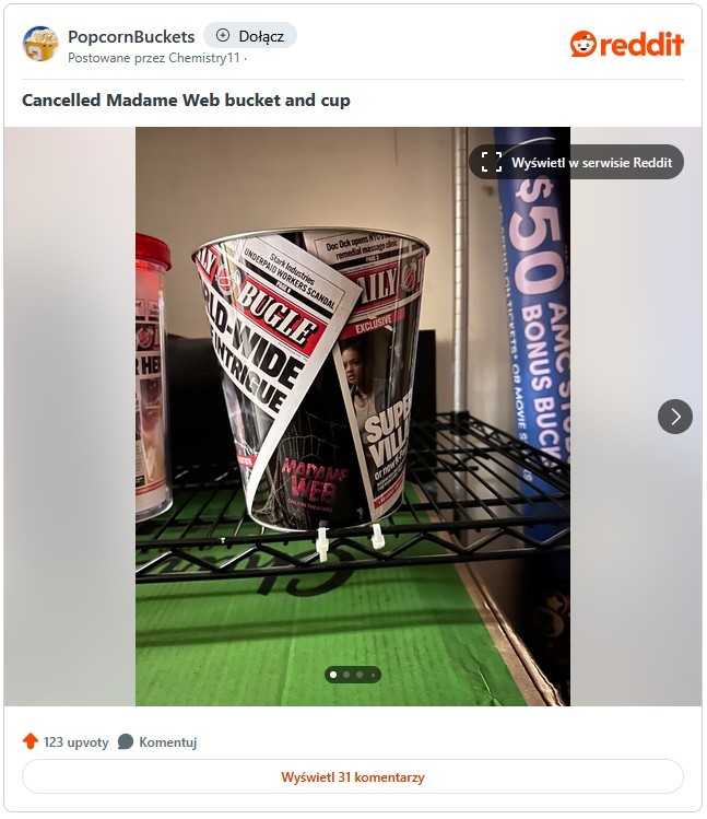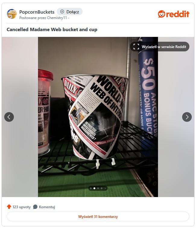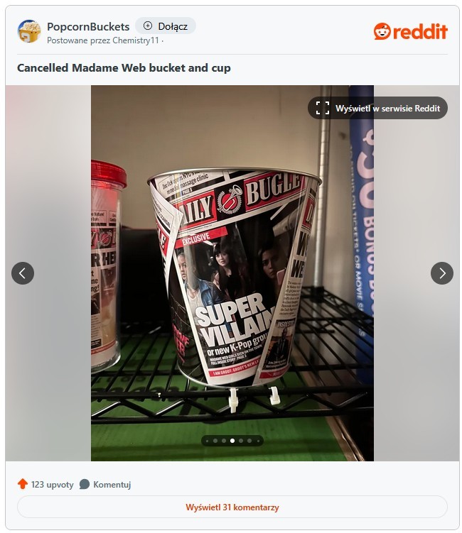 Kubełek popcornu przedstawia artykuły Daily Bugle odnoszące się do wydarzeń i postaci znanych z MCU, co wskazuje, że początkowo rozważano bardziej otwarte powiązanie Madame Web z filmami Marvel Studios. Według osoby, która opublikowała zdjęcia na Reddit, zestawy promocyjne trafiły do kin zaledwie na kilka tygodni przed premierą, po czym zostały wycofane i zniszczone. Zamiast nich Sony rozesłało znacznie skromniejsze pojemniki jedynie z logo filmu, rezygnując z wcześniej zaplanowanej, pełnej wersji gadżetu. Cała sytuacja tylko pogłębia wrażenie chaosu i braku spójnej wizji w działaniach Sony dotyczących ich własnego "Spider-verse".