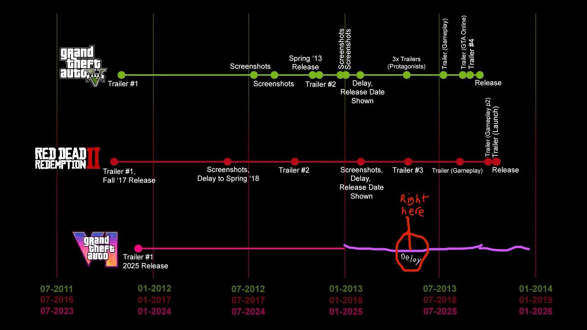 Użytkownik Reddita o nicku Nonesuch1221 opublikował wykres porównujący aktywność promocyjną Rockstara przed opóźnieniem poprzednich tytułów, takich jak GTA 5 i Red Dead Redemption 2, z ciszą medialną dotyczącą GTA 6. Jak zauważył, wcześniejsze gry nawet w okresie opóźnień otrzymywały nowe zrzuty ekranu czy informacje, czego w przypadku GTA 6 zupełnie zabrakło.