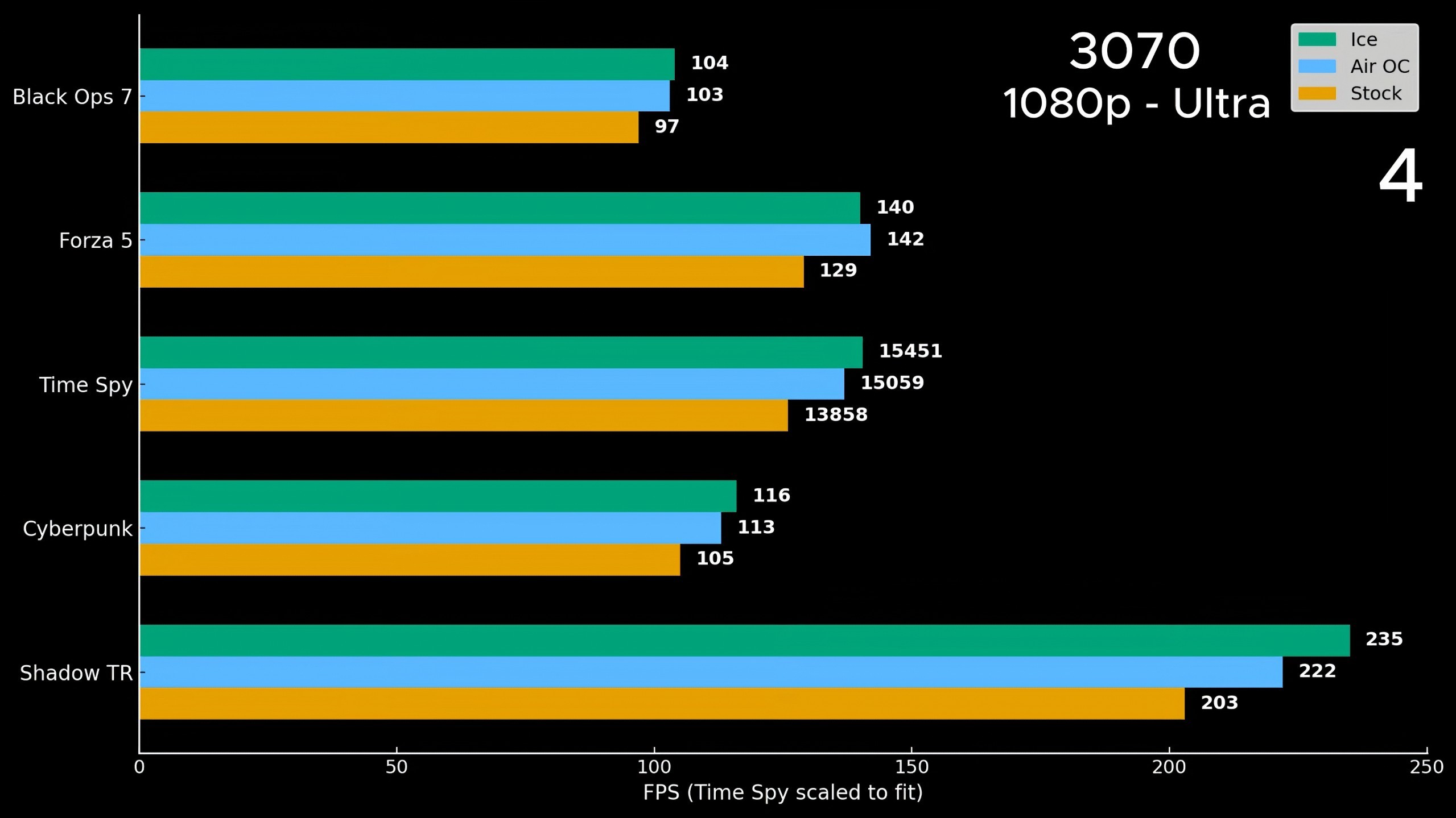 W każdym z przypadków chłodzony lodówką RTX 3070 osiąga wydajność wyższą niż wariant z umiarkowanym OC, a wydajność rośnie o średnio 10%.