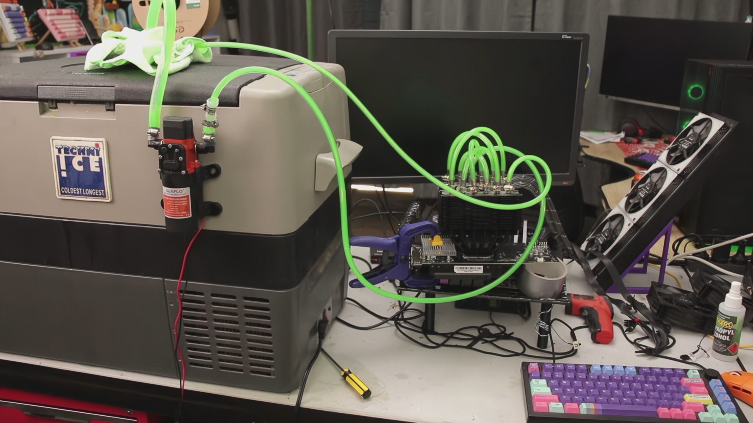 TrashBench w swoim teście wykorzystał chłodzenie Thermalright Peerless Assassin z sześcioma rurkami cieplnymi, małą pompę wody oraz przenośną lodówkę. Twórca doprowadził do karty graficznej przewody chłodzące z wodą chłodzoną w lodówce. Te nietypowe chłodzenie lodowatą wodą było w stanie osiągnąć temperaturę aż -14°C podczas testów na RTX 3070.