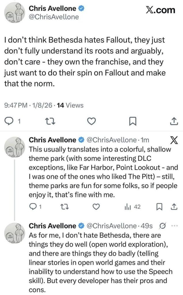 W opublikowanym na platformie X wpisie Avellone stwierdził, że Bethesda nie nienawidzi Fallouta, ale nie rozumie jego fundamentów i nie przywiązuje do nich większej wagi. Według projektanta studio skupia się na tworzeniu własnej wizji serii, która z czasem stała się dominującym standardem.