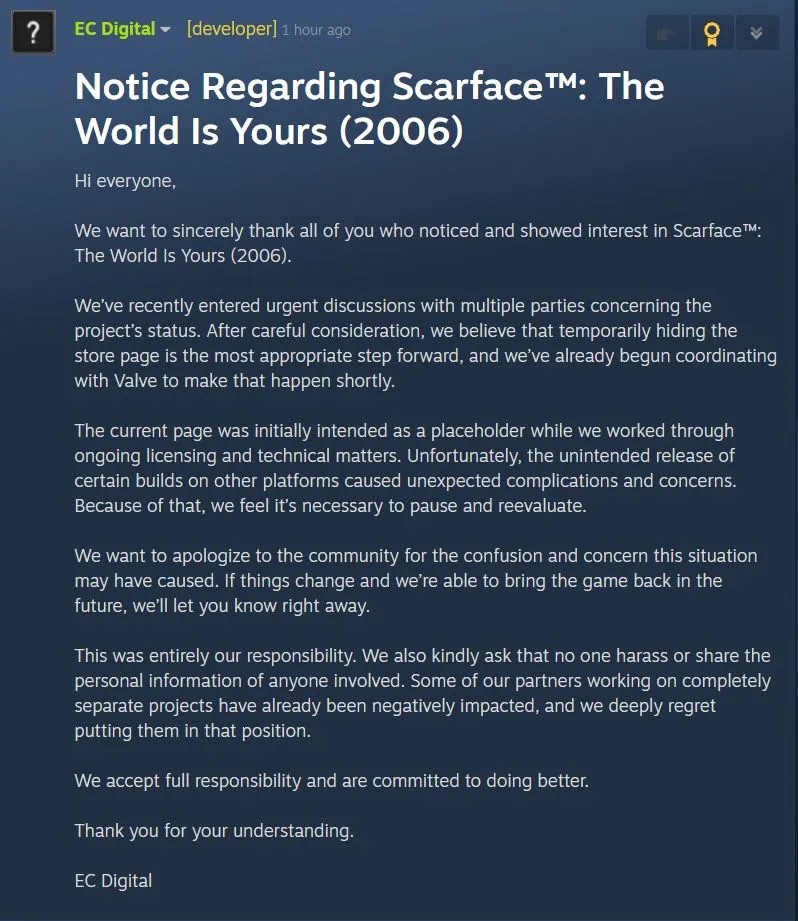 Chcemy podziękować wszystkim, którzy okazali zainteresowanie Scarface: The World Is Yours (2006). Po przeanalizowaniu sytuacji uznaliśmy, że ukrycie strony gry jest obecnie najrozsądniejszym krokiem. Nie chcemy wprowadzać graczy w błąd. Przepraszamy za wszelkie zamieszanie i zobowiązujemy się do pełnej transparentności w przyszłości.