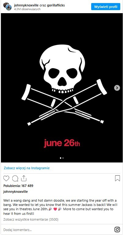 Chcieliśmy dać Wam znać, że tego lata ‚Jackass’ wraca. Do zobaczenia w kinach 26 czerwca. Więcej informacji wkrótce, ale chcieliśmy, żebyście najpierw usłyszeli to od nas.