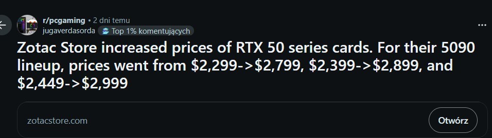 Wątek na Reddicie, który zwrócił uwagę na tę zmianę, twierdzi, że przed ponownym wystawieniem na sprzedaż ceny RTX 5090 wynosiły odpowiednio 2299 USD, 2399 USD i 2449 USD, a cena RTX 5080 wzrosła z 999 USD do 1249 USD.